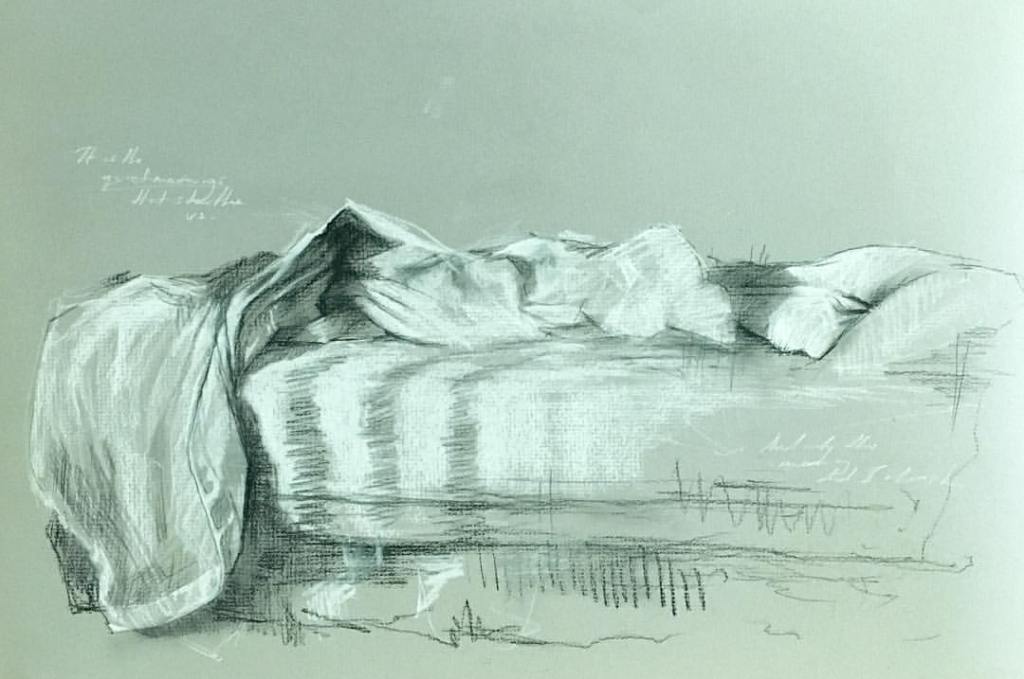 Empty bed, charcoal on toned paper, 10×14, $60
