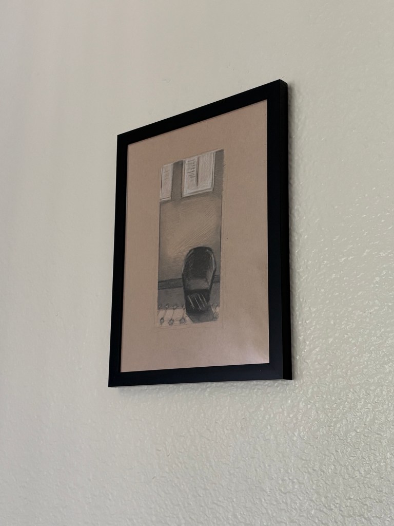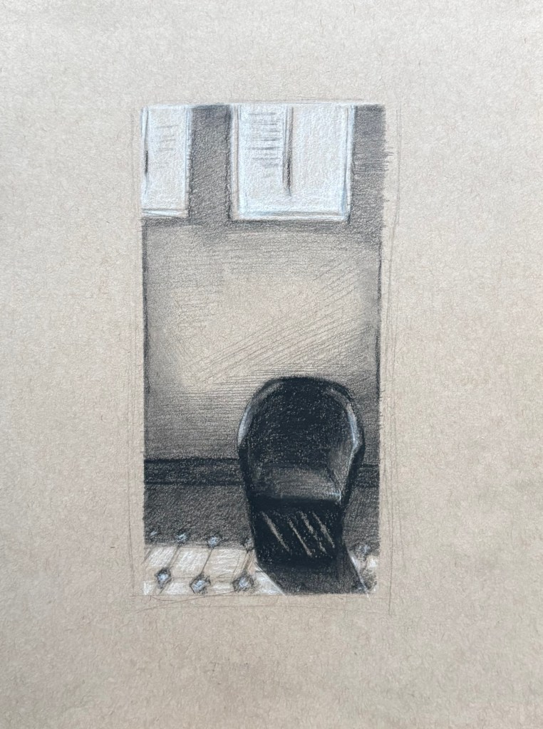 Empty chair, charcoal on toned paper, 9×12, $60